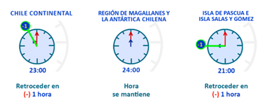 - En Chile Insular Occidental, Isla de Pascua e Isla Salas y Gómez, los relojes deberán atrasarse el mismo día, a contar de las 22:00 hrs. (hora local) pasando al Huso Horario UTC-6 21:00 hrs.